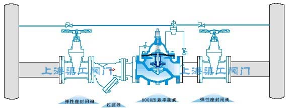 當主閥進出口間壓差變化時,接管A與接管B間壓差發生變化,此變導閥的開度。壓差大時導閥開度大,控制室通過C管的下泄水量增加,主閥控制室壓力下降,主閥開度增加,主閥進出口間壓差變小。反之,若主閥進出口間壓差變小,則導閥開度變小,主閥控制室壓力上升,推動主閥開度減小而使主閥壓差增加。這種負反饋作用使主閥進出口間壓差穩定在社頂值上。設定針閥開度和導閥彈簧壓力可設定主閥進出口間壓差。
